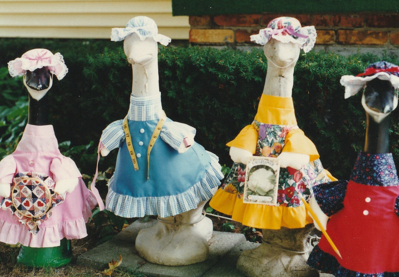 I started making goose clothes and patterns back in the early 1990's. There are 70 patterns available for the geese, many with two designs and some combine the large goose and the baby goose. I also have 18 patterns for the 23" tall cement bears. I will offer from time to time ready made goose clothes and specials on the patterns. Feel free to contact me via email if you have questions.